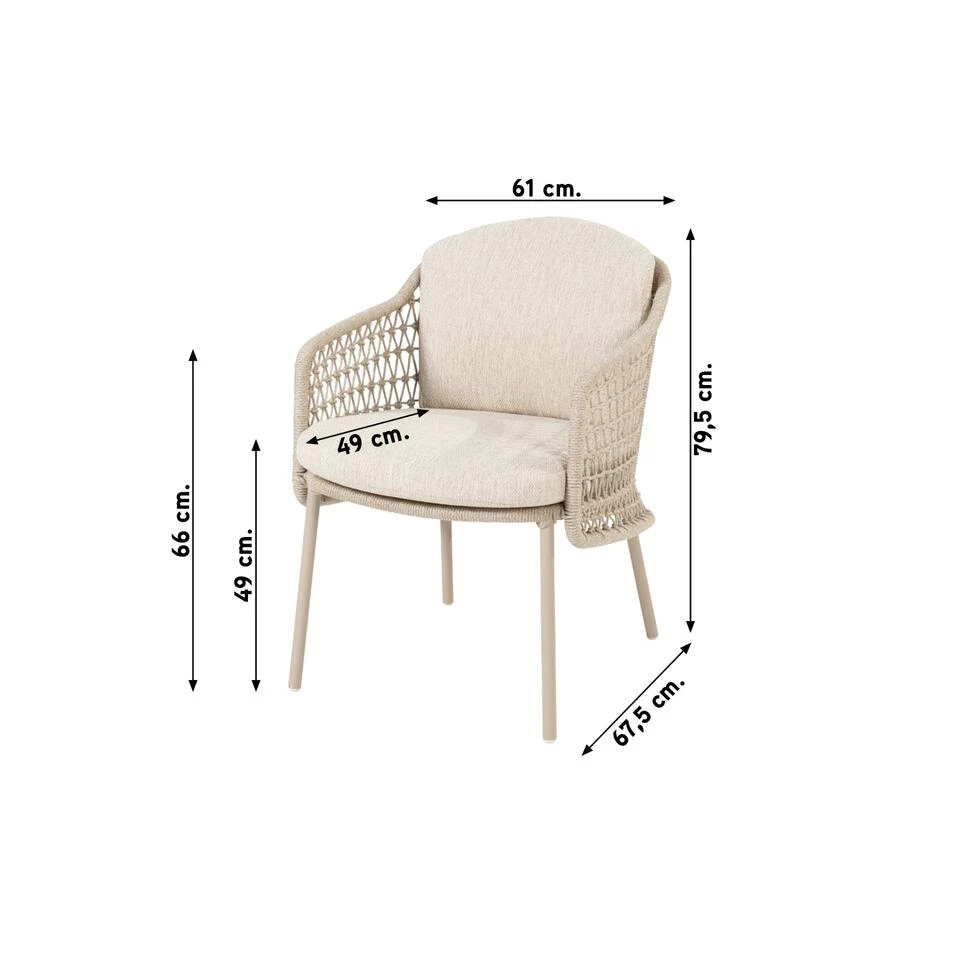 Deze prachtige Puccini tuinstoel van 4 Seasons Outdoor laat veel creativiteit zien. De latte kleur van deze stoelen zorgen voor een hele unieke uitstraling. Het RVS frame van deze stoel heeft een matte coating in deze kleur gekregen. Deze coating zorgt voor optimale weerbestendigheid zodat er nauwelijks tot geen onderhoud nodig is. Het rope heeft dezelfde kleur, zodat het een mooi geheel vormt samen. De ronde draden die gebruikt worden zijn voorzien van een kunststof kern. Het omhulsel van het touw wordt gemaakt van een weerbestendige stof, het voelt zacht aan en is waterafstotend, Uv-bestendig en kleurvast. Zo weet je zeker dat jij jarenlang kunt genieten van jouw Puccini tuinstoel! De kussen hebben een hoes van Olefin, een kleurvaste stof die Uv-bestendig is en waterafstotend. De kussens kunnen dus gewoon tegen een regenbuitje. Mochten ze vies zijn geworden, kan je ze makkelijk wassen op 30 graden middels de rits in de hoes.Â