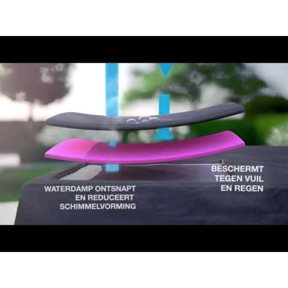 Met deze Aerocover hoes beschermt jij je tuinset optimaal. De hoes beschermt tegen alle weersinvloeden en voorkomt bovendien schimmelvorming. De afmeting van de tuinsethoes is 260 centimeter breed, 190 centimeter diep, en 85 centimeter hoog. De Aerocover tuinsethoes is gemaakt van ripstop polyester. Dit is een polyester stof met een speciaal raster van vierkantjes. Deze vierkantjes zorgen ervoor dat de hoes soepel blijft. Ook zorgen ze ervoor dat als er een gaatje in de hoes komt deze niet verder scheurt. Het voordeel van deze hoes is dat de stof ademend is. Dit zorgt ervoor dat het vocht dat onder de hoes komt kan ontsnappen. Zo blijven je kussens droog onder de hoes en zal er geen schimmelvorming ontstaan. Door het aantrekkoord aan de onderzijde kun je de beschermhoes mooi strak zetten.Â