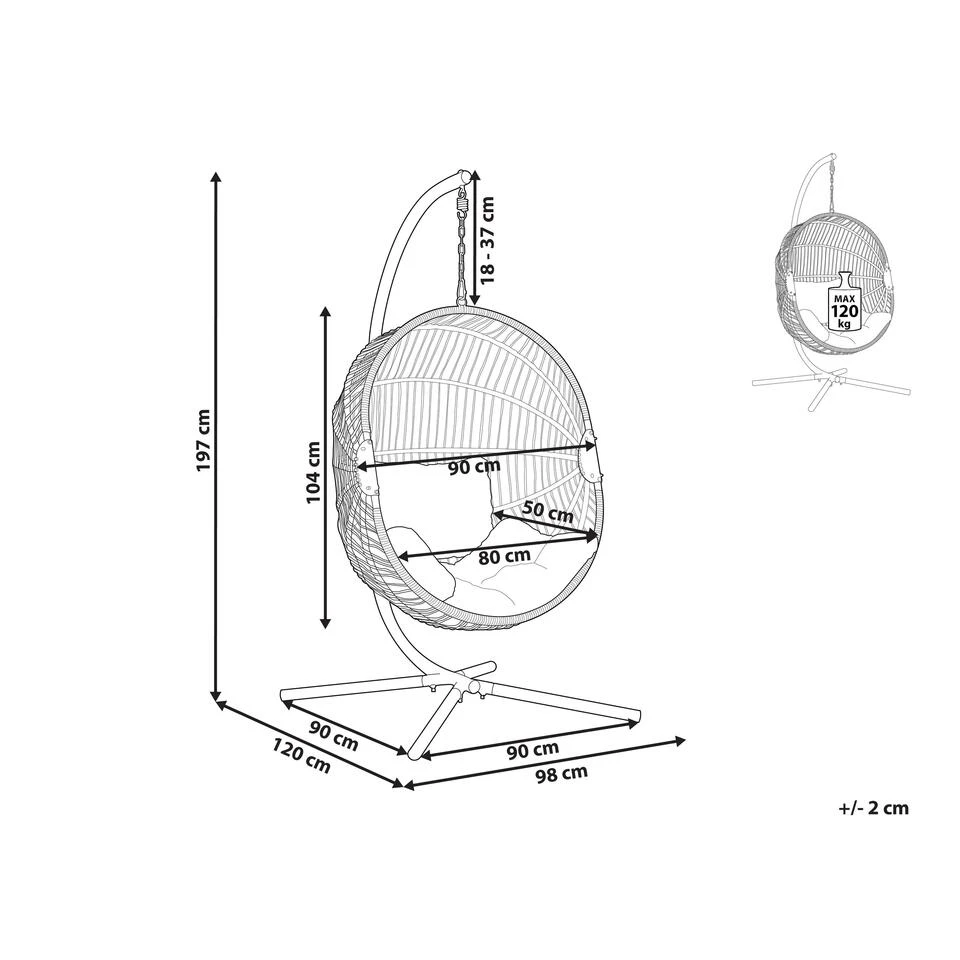 Bohemian hangstoel met standaard. Creëer een ware ontspanningszone met deze hangstoel. De stoel is gemaakt van sterk PE-rotan touw en metalen standaard, heeft een solide constructie en kan zowel in huis als in de tuin worden geplaatst. Hij wordt geleverd met dikke zit- en rugkussens, waardoor de stoel een perfecte plek is om jezelf op te laden. Het prachtige boho-ontwerp van de stoel maakt hem een ideale aanvulling op interieurs in natuurlijke stijl of op elke buitenruimte. Ga lekker in de stoel zitten en ontspan.