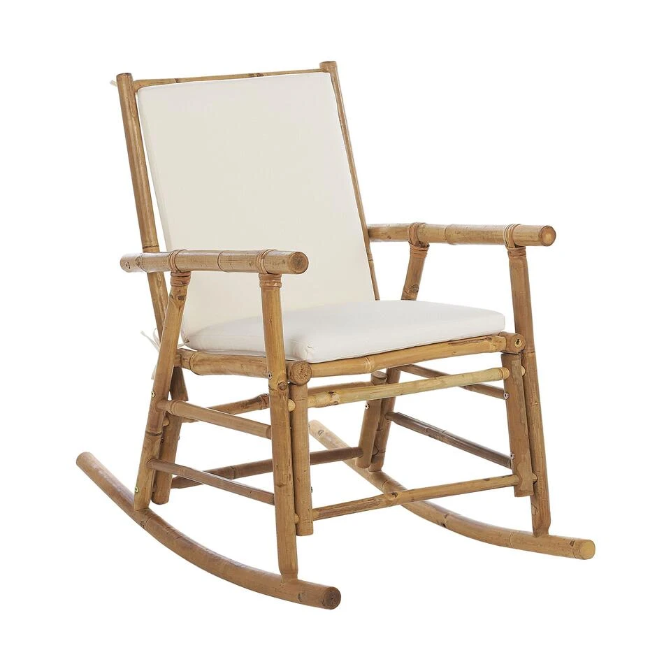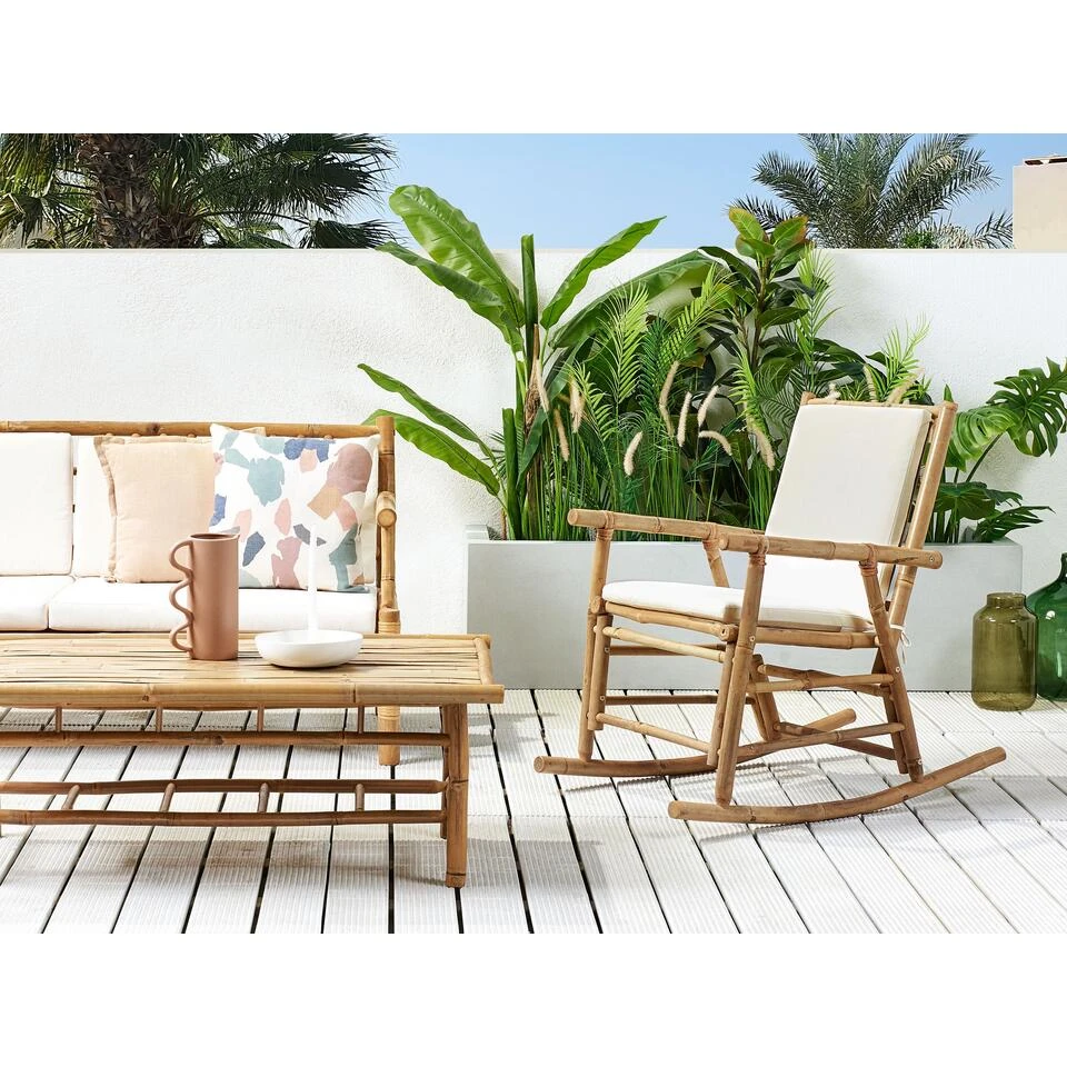 Boho schommelstoel. Deze schommelstoel brengt ontspannen naar een hoger niveau. Volledig gemaakt van natuurlijke materialen zoals bamboe voor een stevige constructie. Daarnaast heeft de stoel een dikke zitting en een rugkussen om het comfort te verhogen. Dankzij het ontwerp is de stoel perfect voor zowel binnen als buiten en het heeft een boho sfeer.