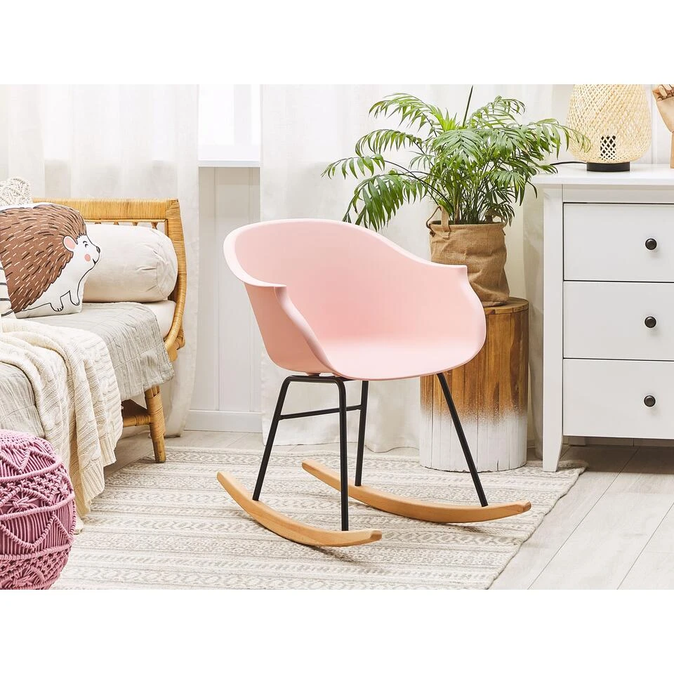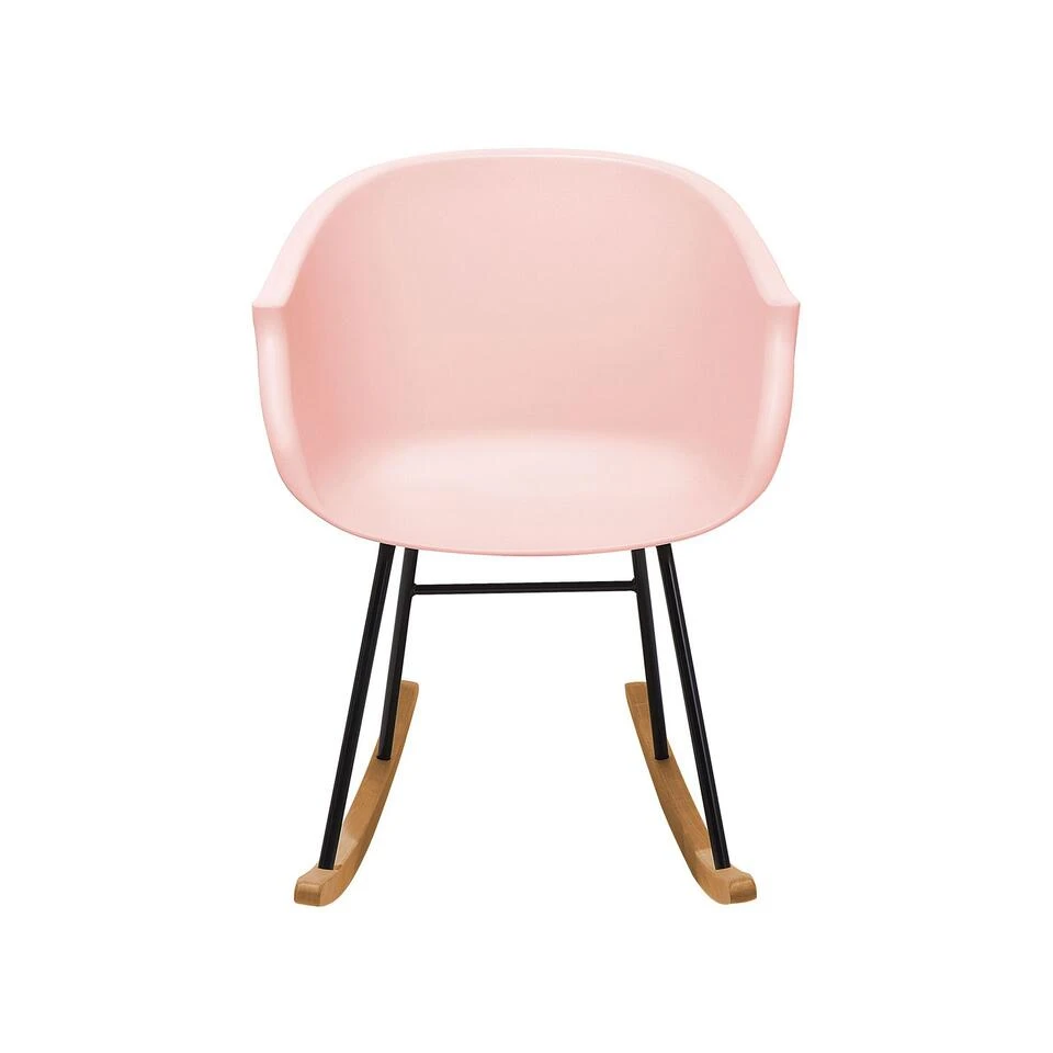 Vrolijke schommelstoel gemaakt van roze kunststof en natuurlijk hout. Deze stoel is een vrolijke nieuwe variant van de klassieke, aangename schommelstoel uit de goede, oude tijd. Dankzij de prettig gevormde rug- en armleuningen is de schommelstoel zo aangenaam als een fauteuil. De schommelfunctie zorgt voor een ontspannen zitcomfort. De zitting is gemaakt van slijtvast kunststof. Het slanke en stabiele metalen onderstel van de schommelstoel staat op natuurkleurige latten van degelijk, gerecycled hout. Met zijn smalle design is de schommelstoel niet alleen geschikt als zitplaats in een knusse leeshoek, maar ook als eetkamerstoel voor een actieve zit ervaring.