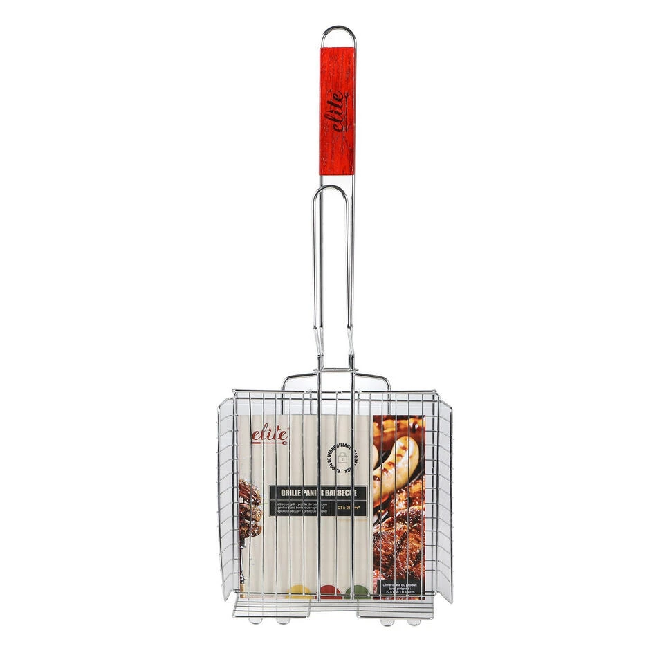 Elite BBQ/barbecue rooster grill mandje gemaakt van chrome metaal/hout met afmetingen 22 x 58 x 5 cm. Handig bbq gereedschap om vlees, groente of vis te grillen en gemakkelijk om te draaien zonder uw handen te verbranden. Braadrooster met klempositie verhoger beugel. Geniet van uw bbq maaltijd.