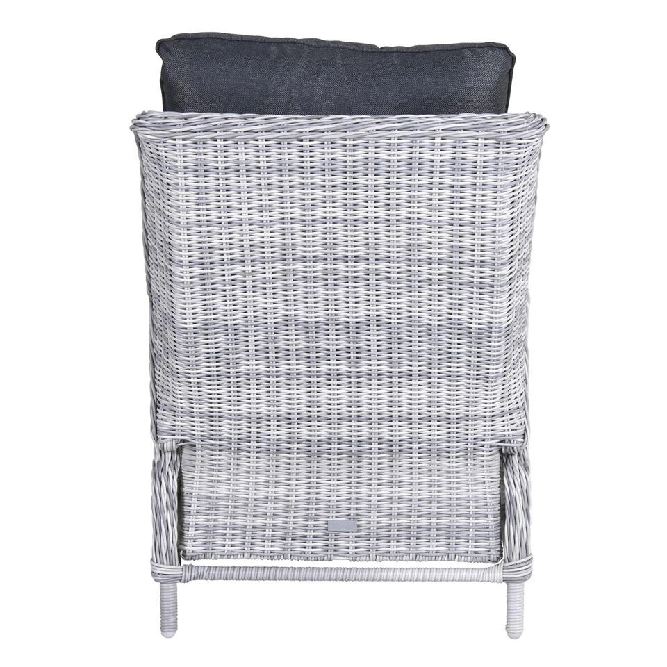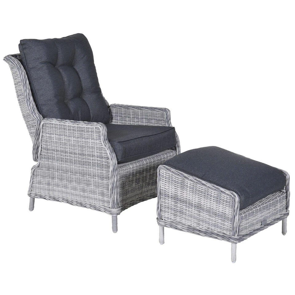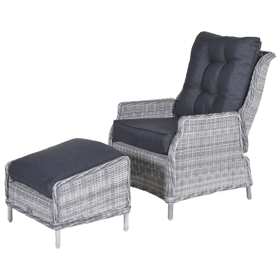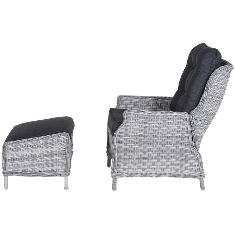 De Santa Rosa stoel beschikt over een onderhoudsvrij aluminium binnenframe met daaromheen hand gevlochten 5mm half rond kunststof wicker vlechtwerkdraad in de kleur cloudy grey. Deze relax lounge stoel wordt compleet geleverd inclusief bijpassende voetenbank, zodat je heerlijk met de voeten omhoog kunt relaxen.
