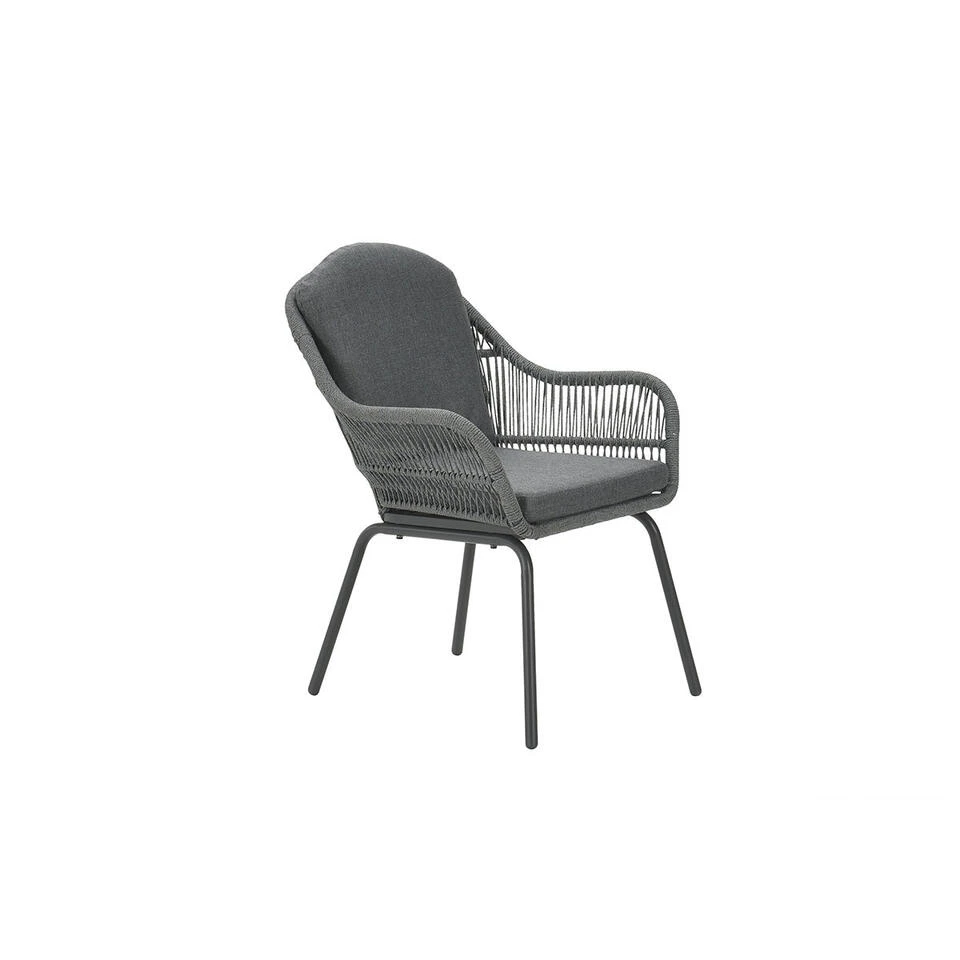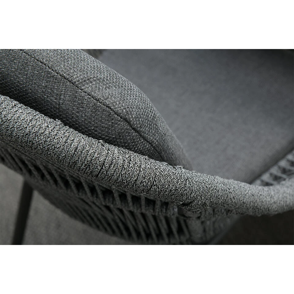 De Yima tuinstoel is in twee kleurstellingen verkrijgbaar: donker grijs met licht grijs rope en mystic grijze kussens of donker grijs met mos groen rope en mystic grijze kussens.
