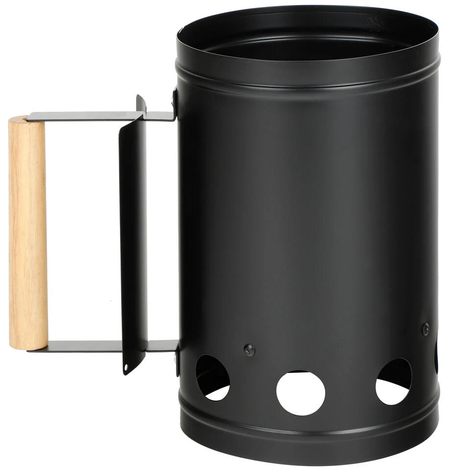 BBQ/Barbecue briketten starter met houten handvat 27 cm. Met deze barbecuestarter maak je houtskool of briketten gebruiksklaar waardoor je sneller met de barbecue kan starten. Kleur: Zwart.
