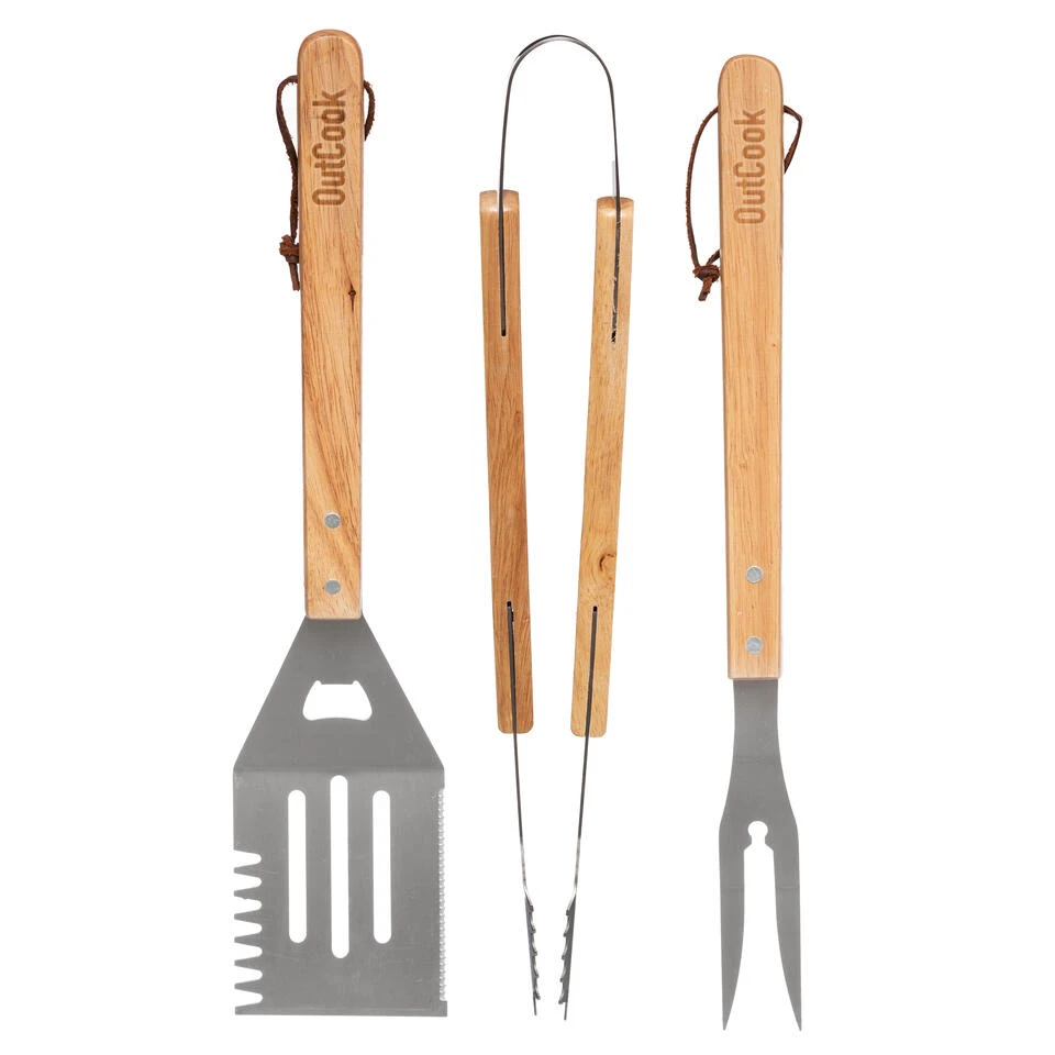 BBQ/barbecue gereedschap set 3-delig met houten handvatten. Roestvrij stalen gereedschap set voor op de barbecue bestaande uit een tang, vork en spatel.
