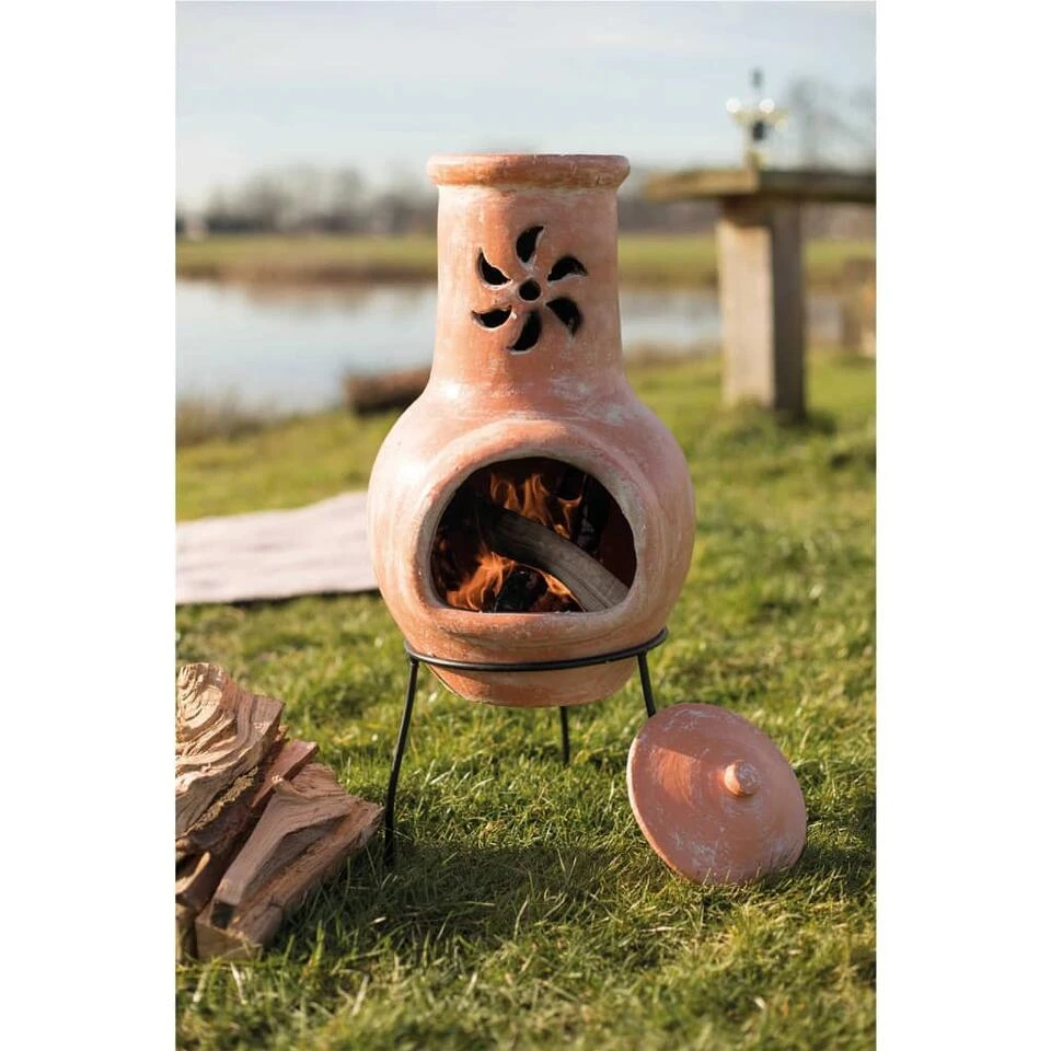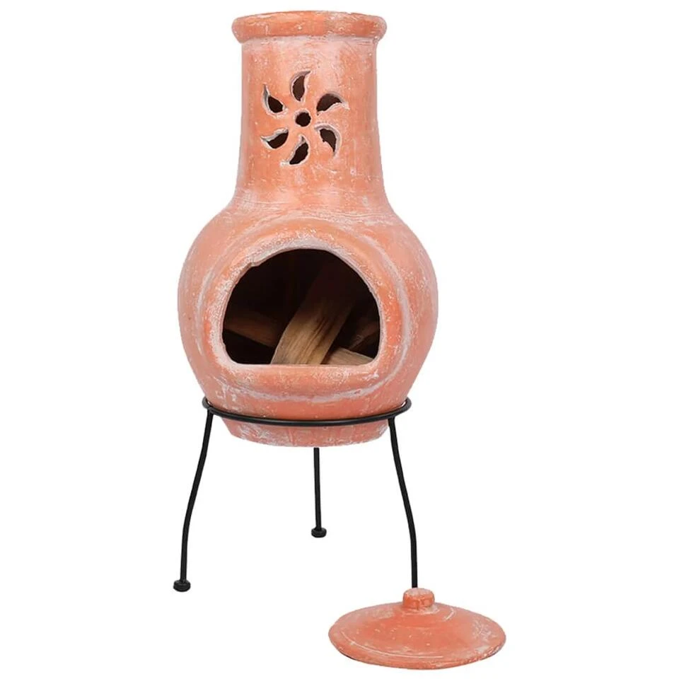 - Inclusief een stevig zwart standaard van gepoedercoat staal en een schoorsteendeksel van klei