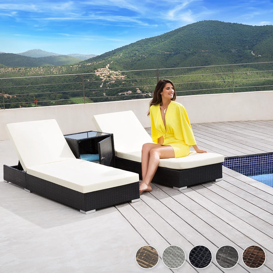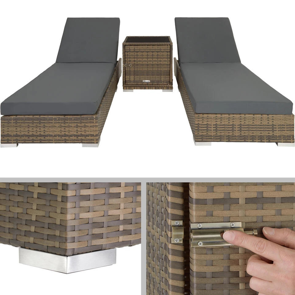 Deze mooie set bestaat uit 2 ligbedden met een bijzettafel. En is perfect om te relaxen en te ontspannen in de tuin of op het terras. Misstaat ook zeker niet op een balkon of in de sauna. Uitgerust met beige en grijze kussenhoezen, hiermee kunt u in een handomdraai de set van uiterlijk doen veranderen. De mooie bijzettafel, heeft een donkere glazen plaat en geeft u de mogelijkheid om bijvoorbeeld zonnebrandcreme of handdoeken op te bergen.