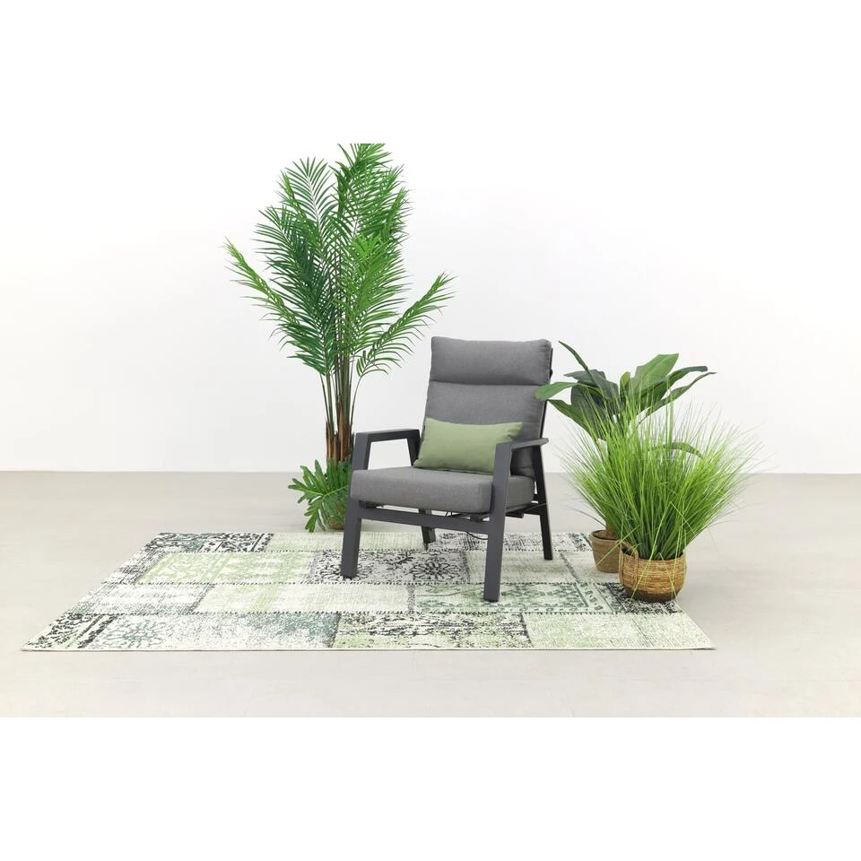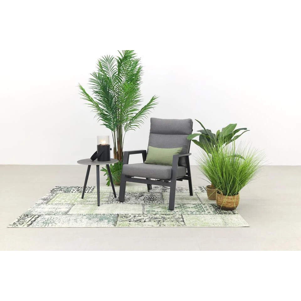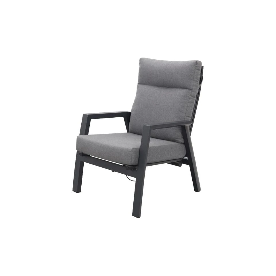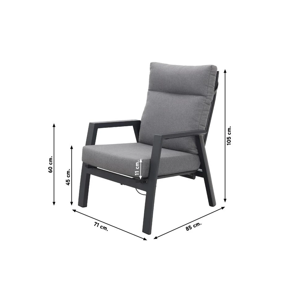 De rugleuningen van de Azoren loungestoel is verstelbaar middels de knop aan de binnenkant van de armleuning. Hierdoor zit de knop niet in het zicht waardoor het niet storend is. Het onderstel van de stoel is gemaakt van aluminium. Het aluminium is voorzien van een antraciet kleurige coating die kras- en stootvast is. Het antraciet kleurige frame combineert perfect bij de grijze kussens en zorgt dan ook voor een stijlvolle uitstraling. Tussen dit frame is een textileen doek gespannen. In dit doek zit iets rek wat ervoor zorgt dat de stoel een fantastisch zitcomfort heeft. Let op dat je de kussens na gebruik op een droge en geventileerde plek opbergt, ze zijn namelijk niet waterbestendig. Uiteraard kunnen ze echt wel een keer tegen een buitje regen maar zijn ze hier niet speciaal voor gemaakt.