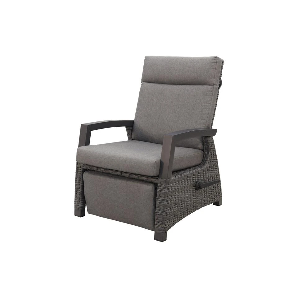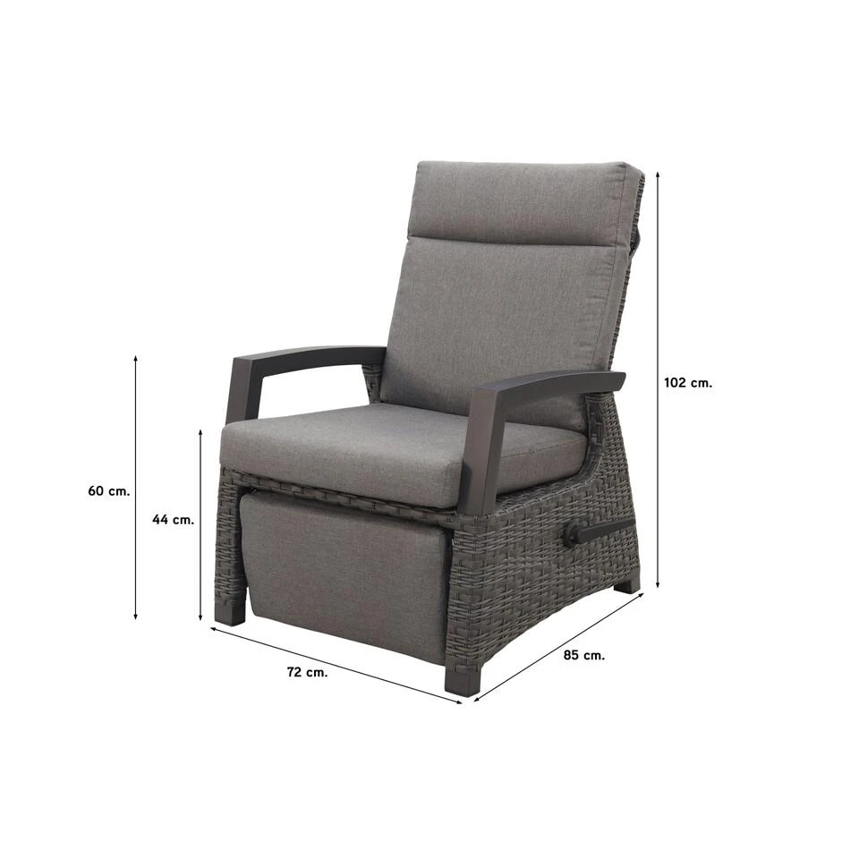 De Loungestoel heeft een aluminium gepoedercoated frame. Aluminium heeft als voordeel het gewicht, de stevigheid en het materiaal kan niet gaan roesten. Om dit frame is het wicker gevlochten. Het wicker is uitgevoerd in de kleur antraciet. Dit combineert mooi bij het antraciet frame van de wicker verstelbare loungestoel. Het zit en rugkussen is uitgevoerd in een grijze kleur. Het zitkussen is voorzien van een ritssluiting zodat het, als vuil is geworden, uitgewassen kan worden. Aan de bovenkant van het rugkussens zijn “hengsels” gemaakt die het kussen mooi op zijn plaats houden.